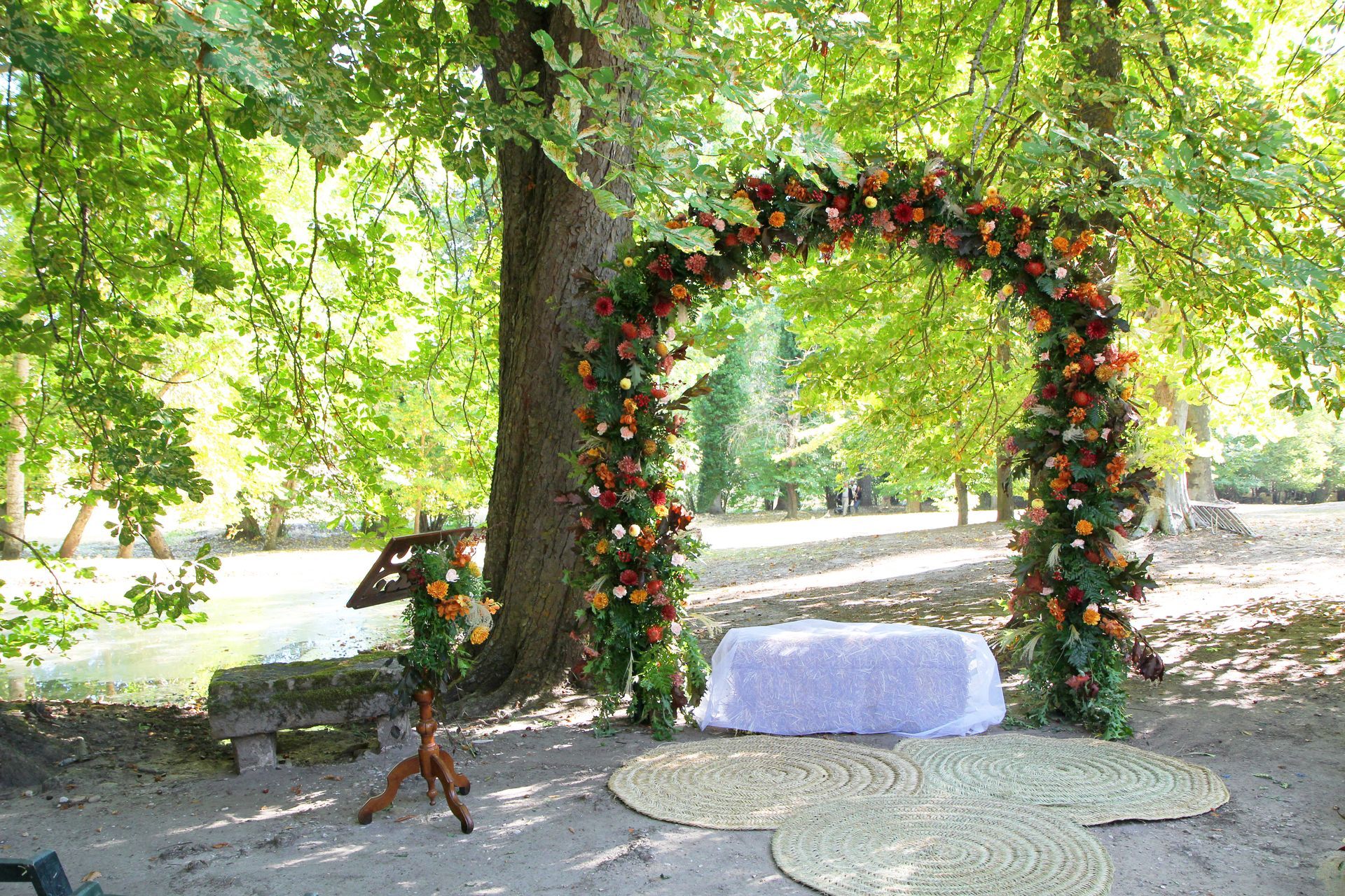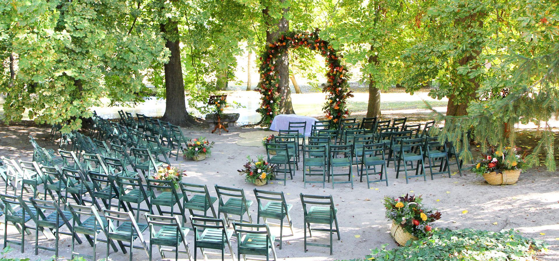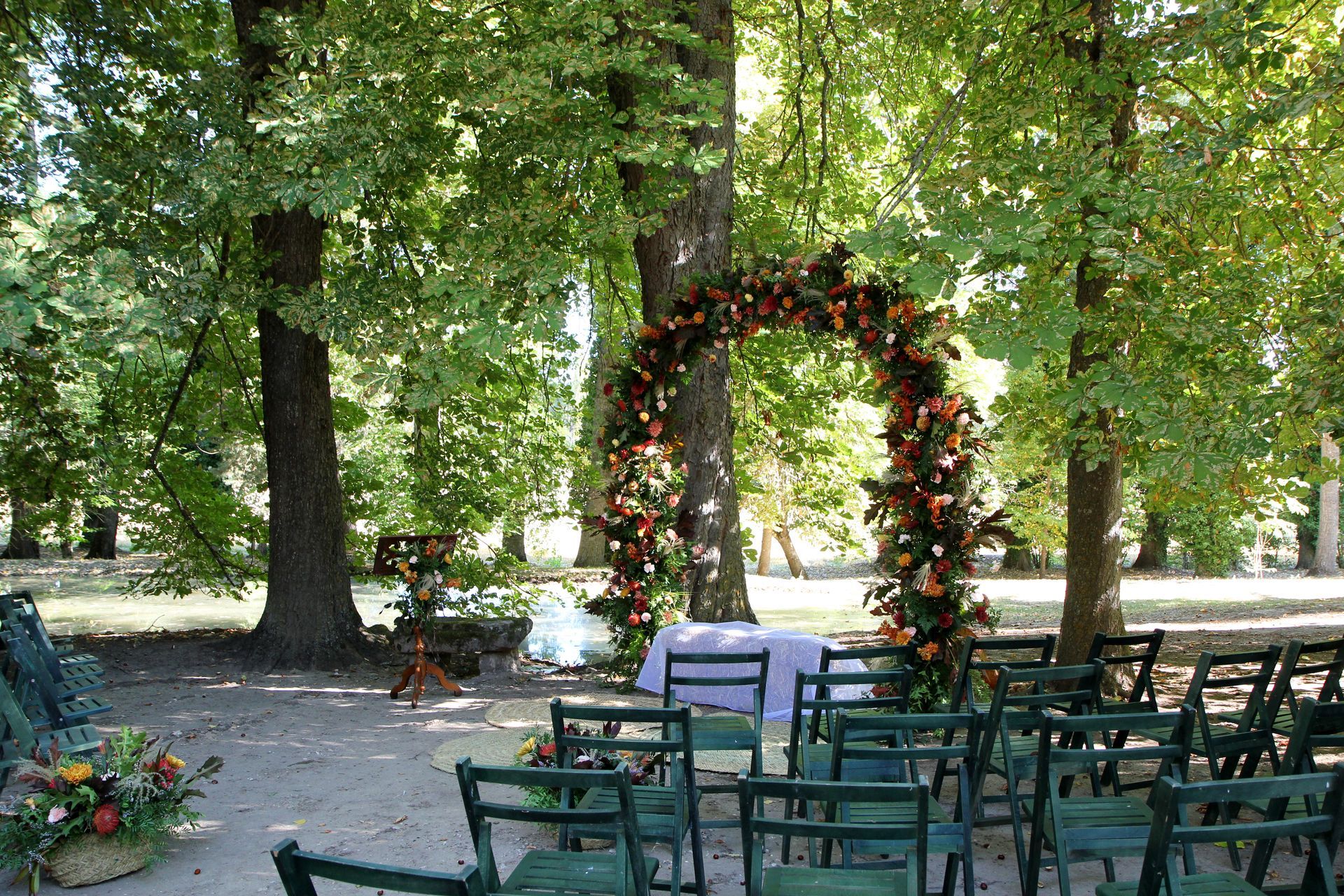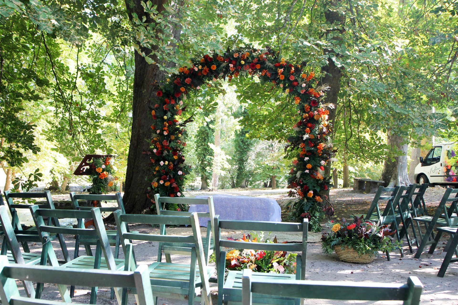 Ceremonia en exterior con arco, atril y adorno de pasillo.