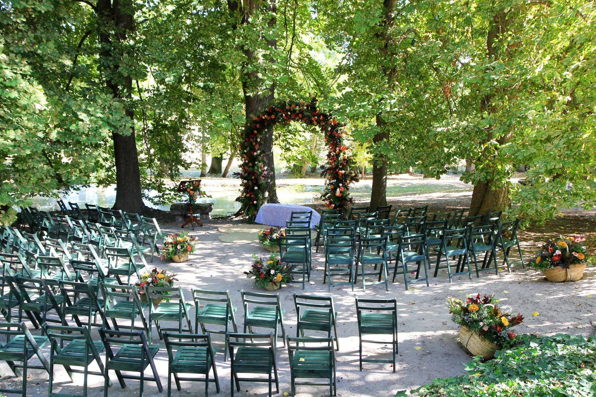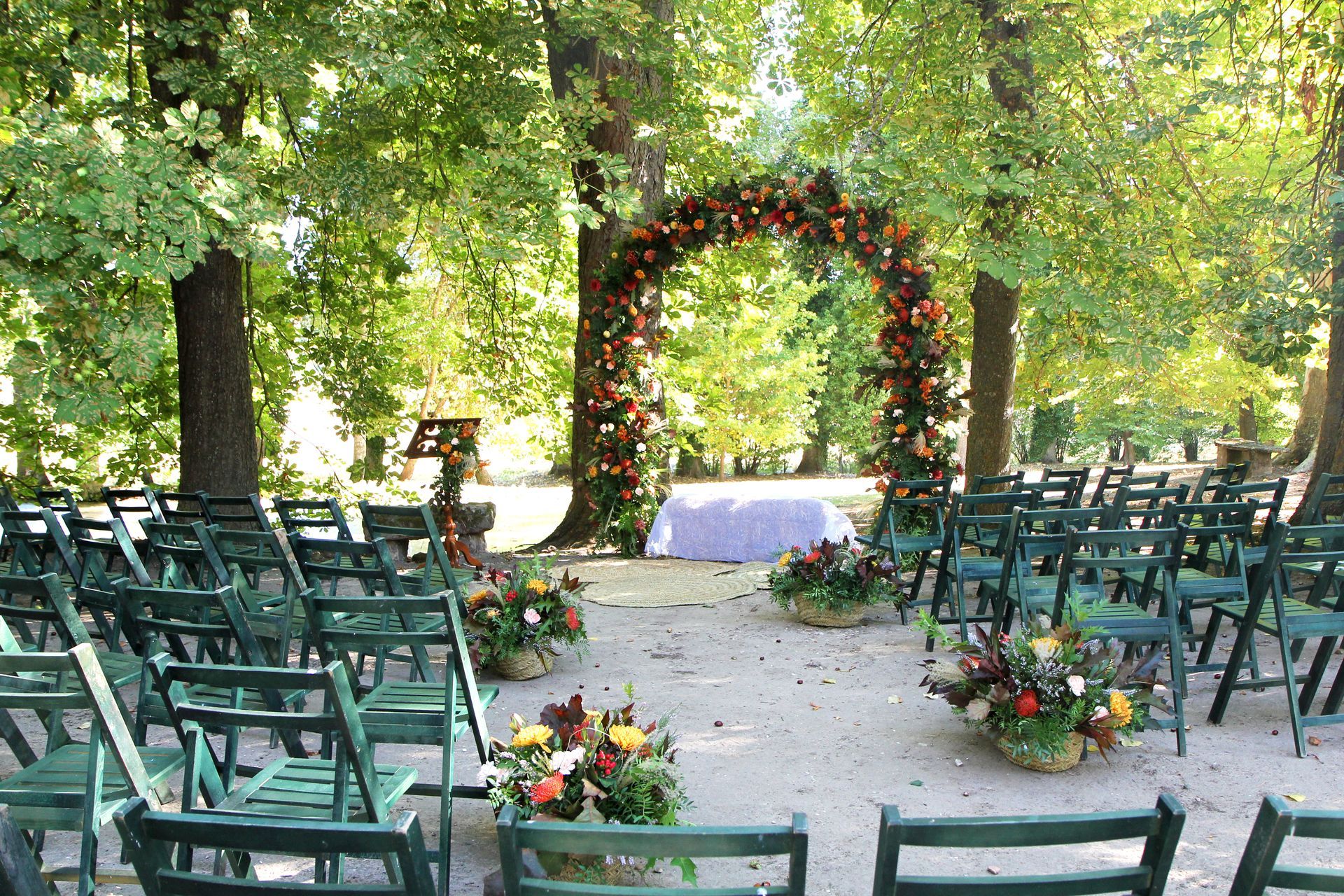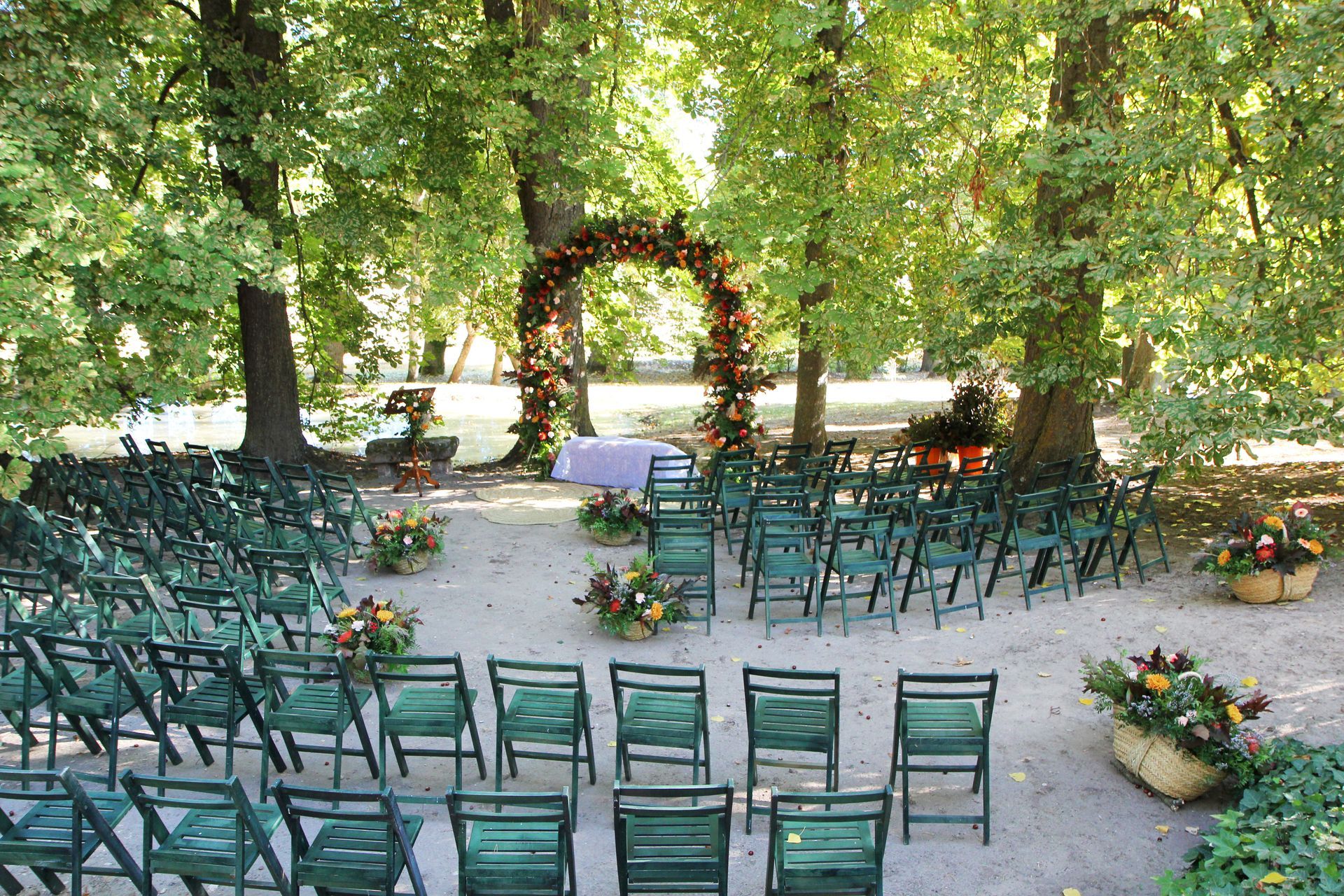 Ceremonia en exterior con arco, atril y adorno de pasillo.