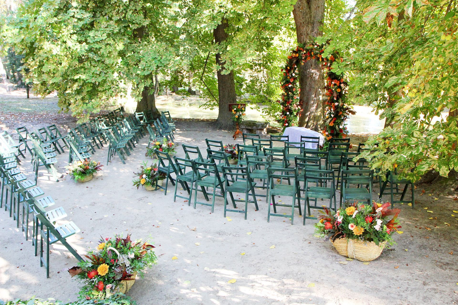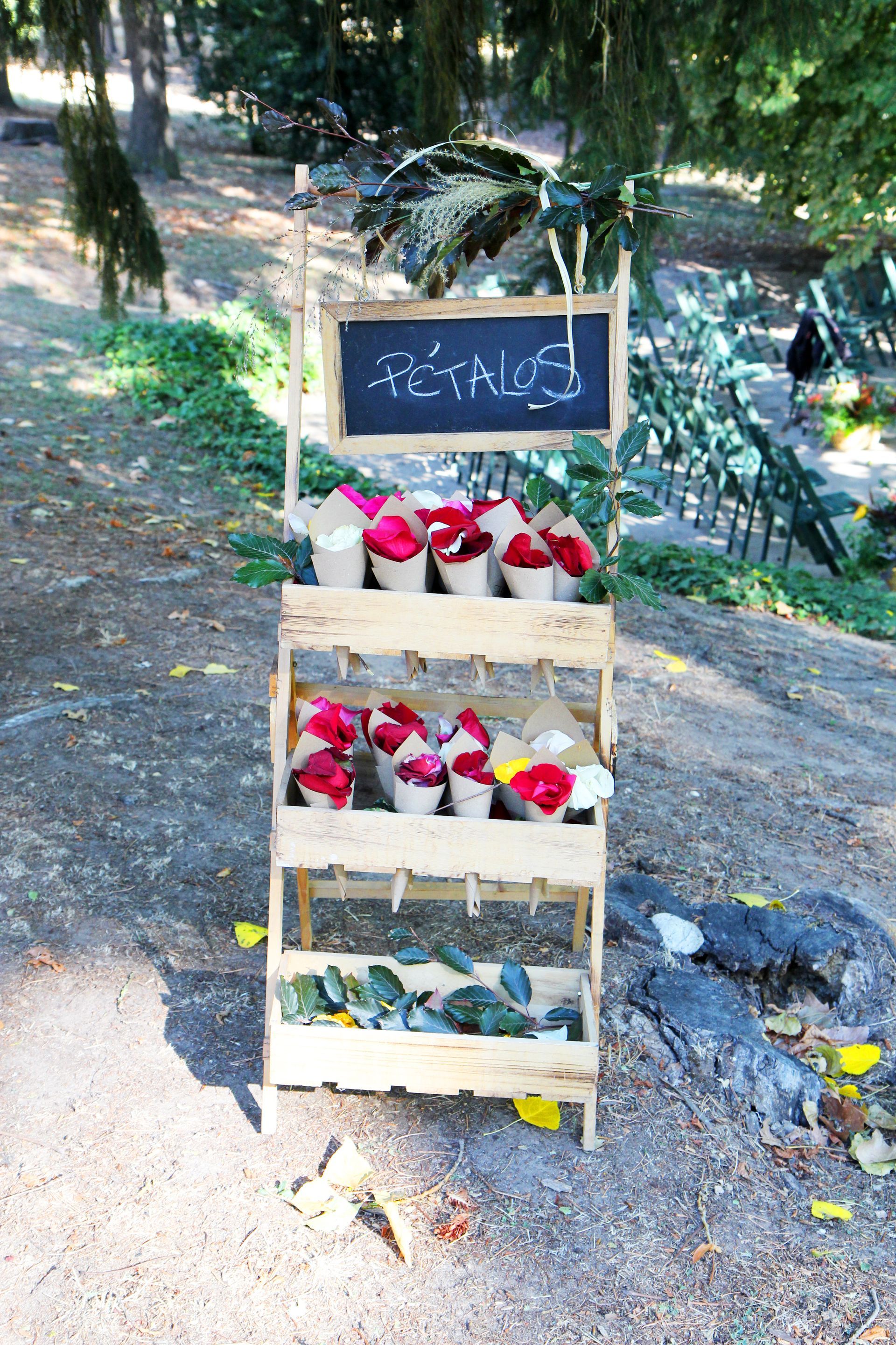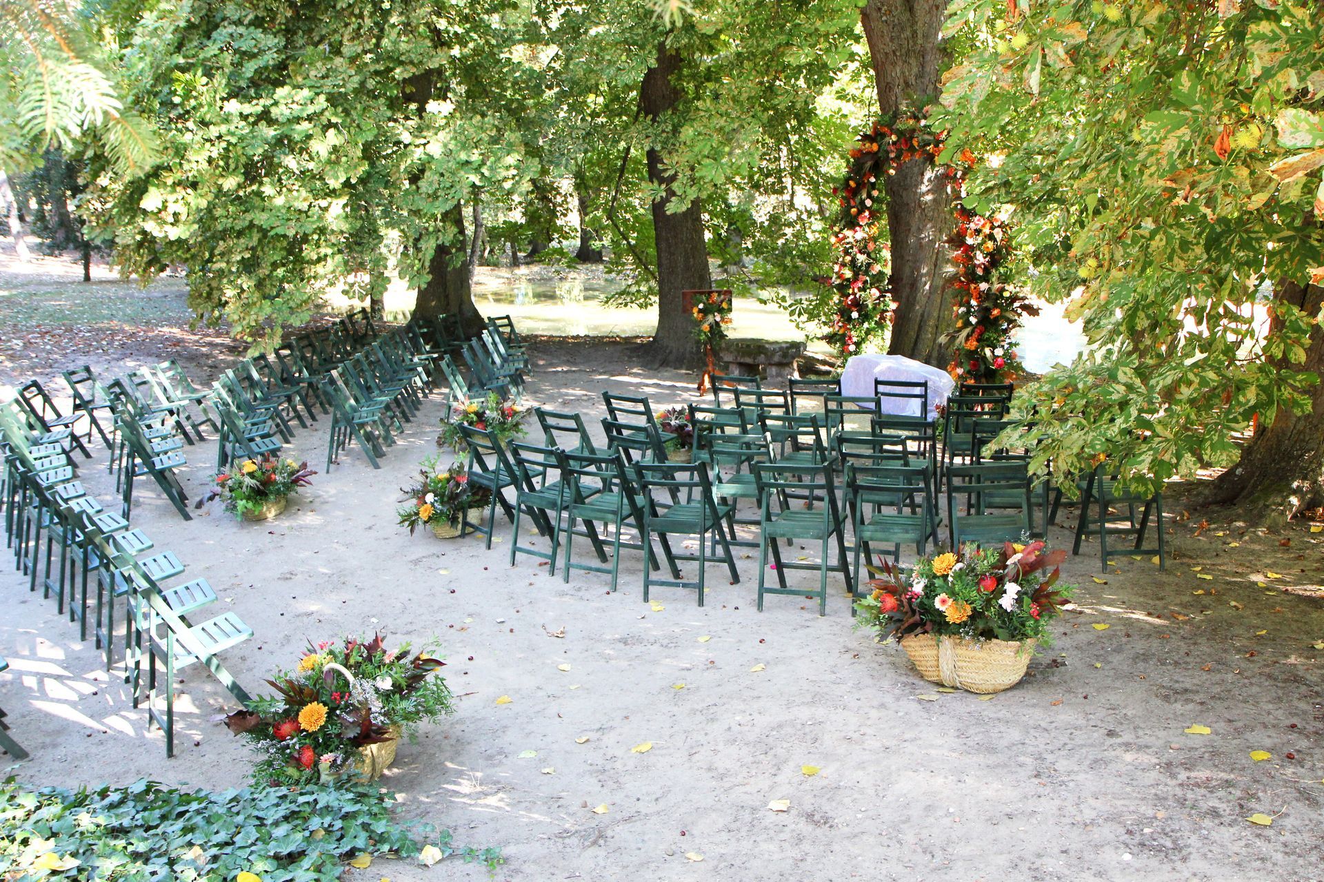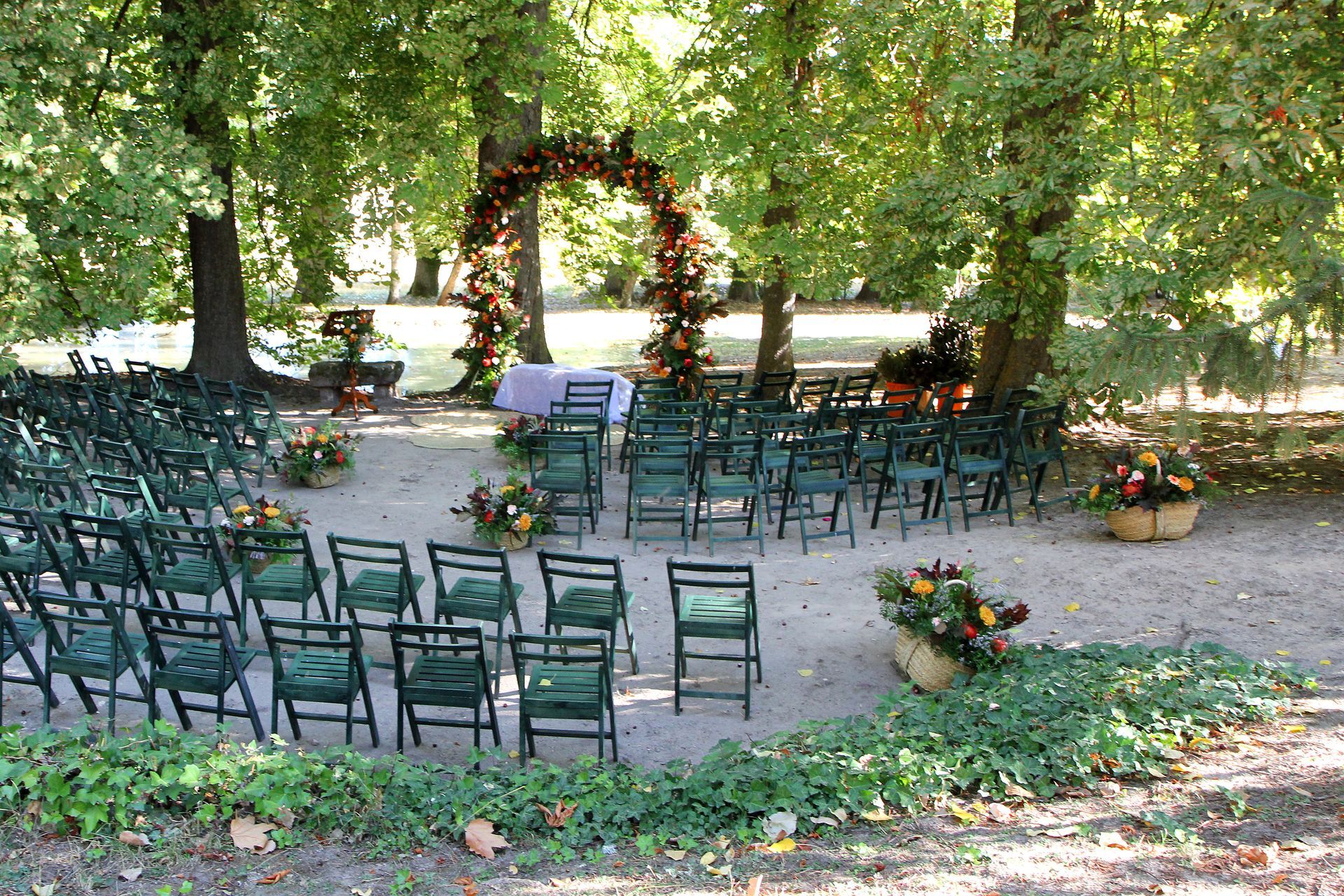 Ceremonia en exterior con arco, atril y adorno de pasillo.