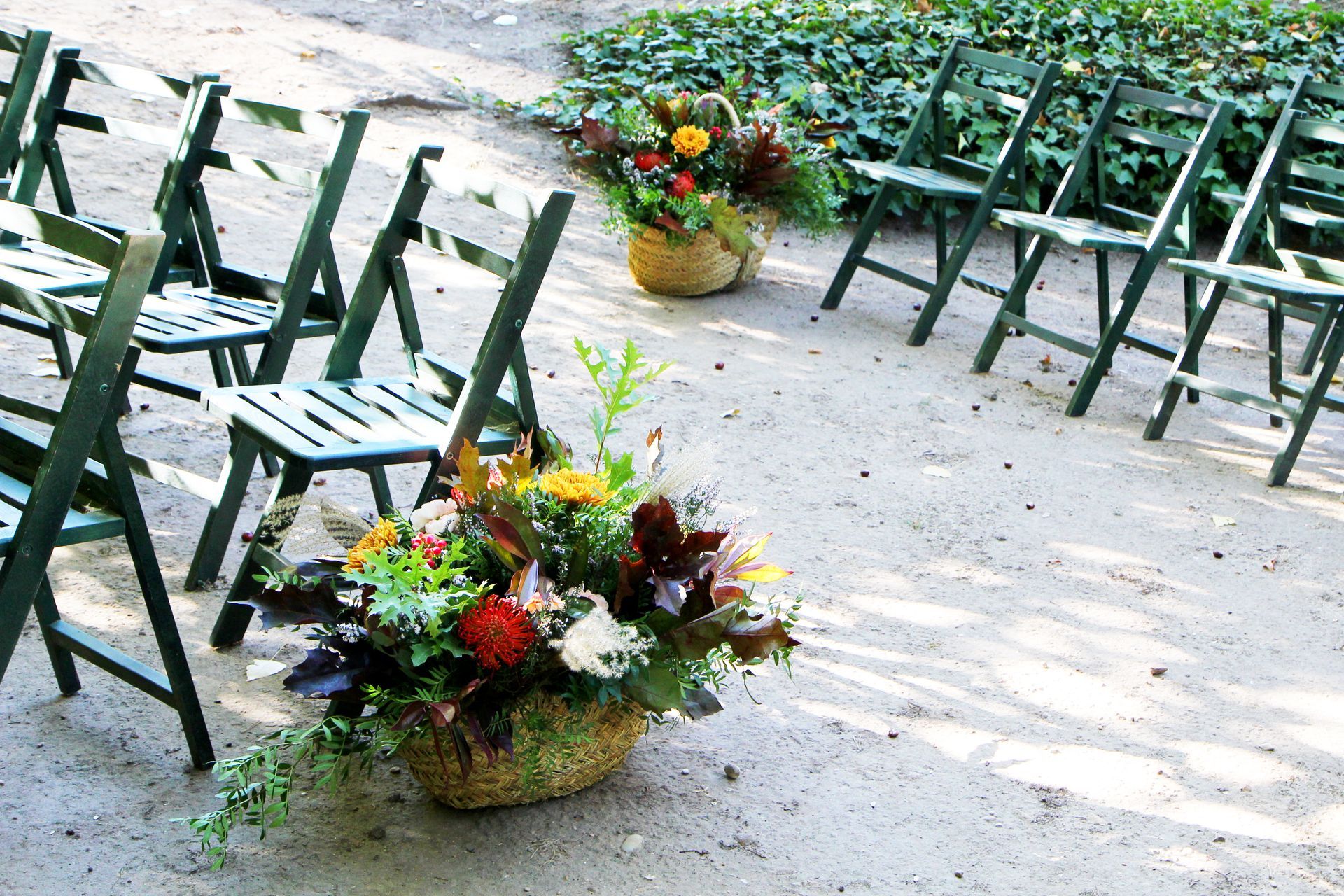 El pasillo se ha adornado con cestos de mimbre de las mismas flores.