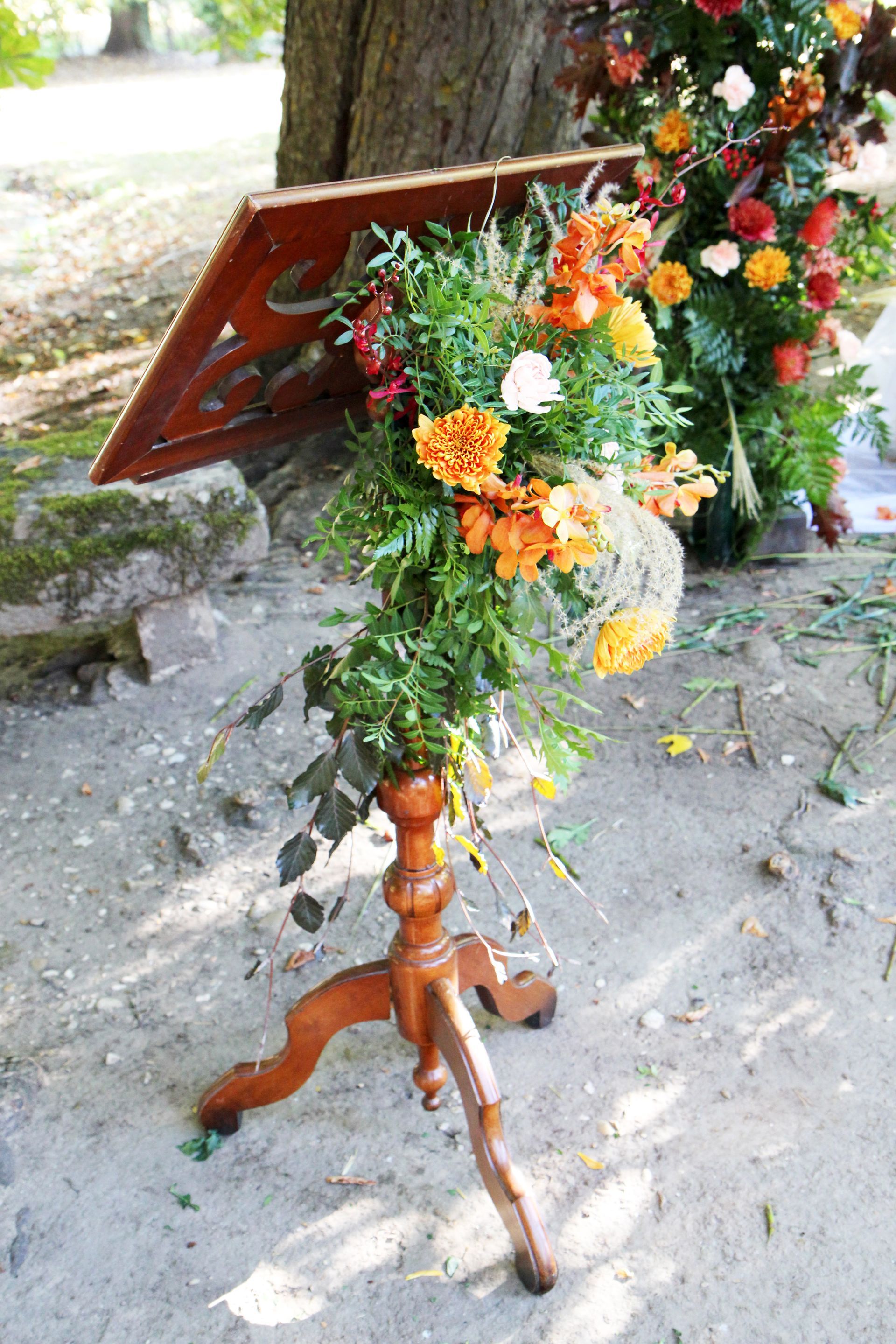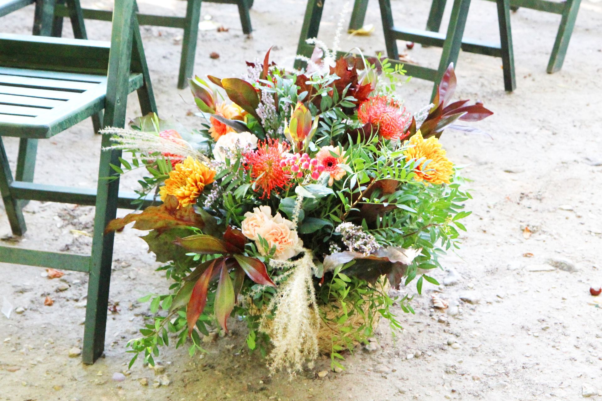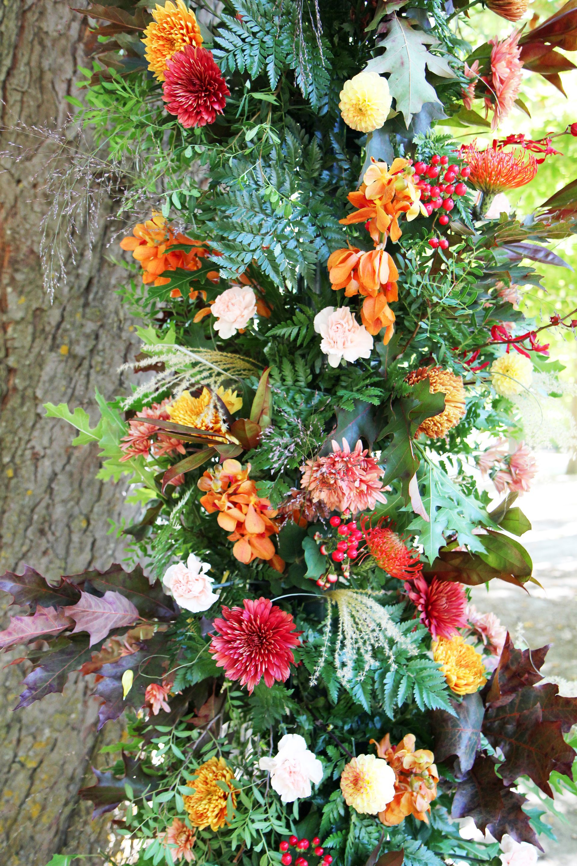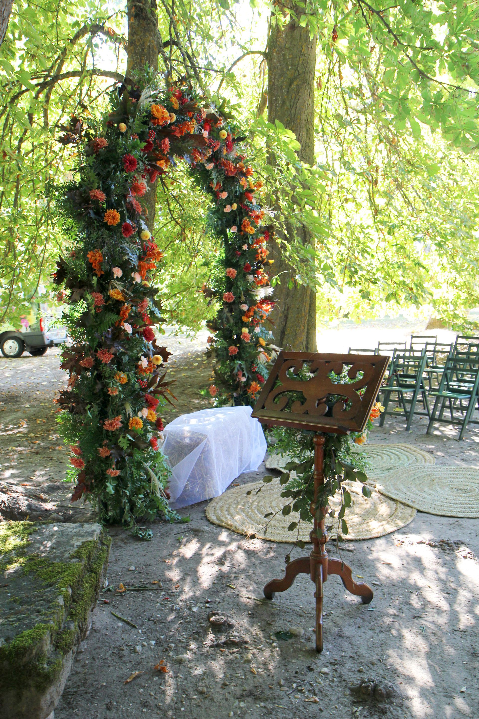 Arco de ceremonia ealizado en tonos otoñales con hojas de roble como verde.