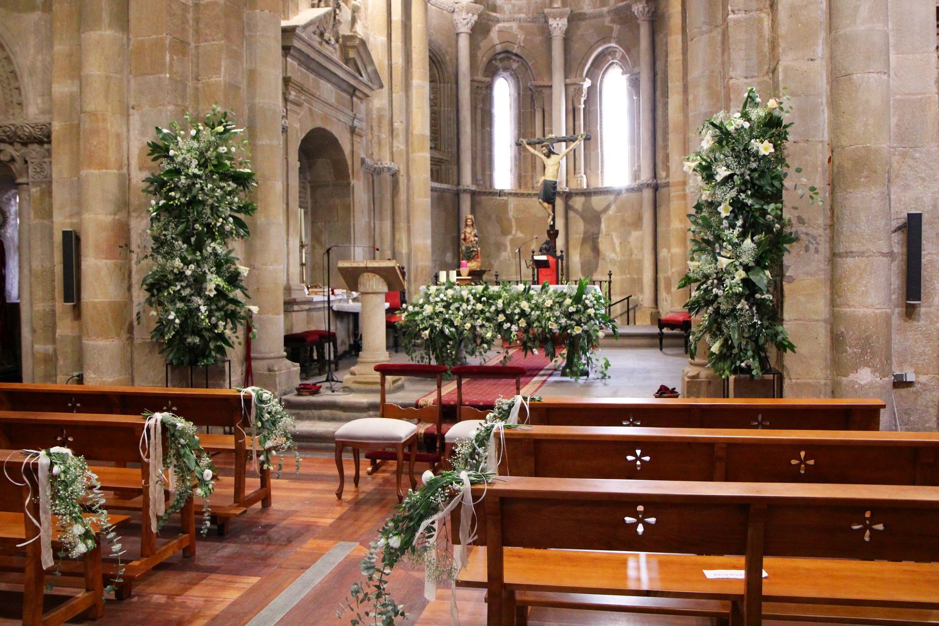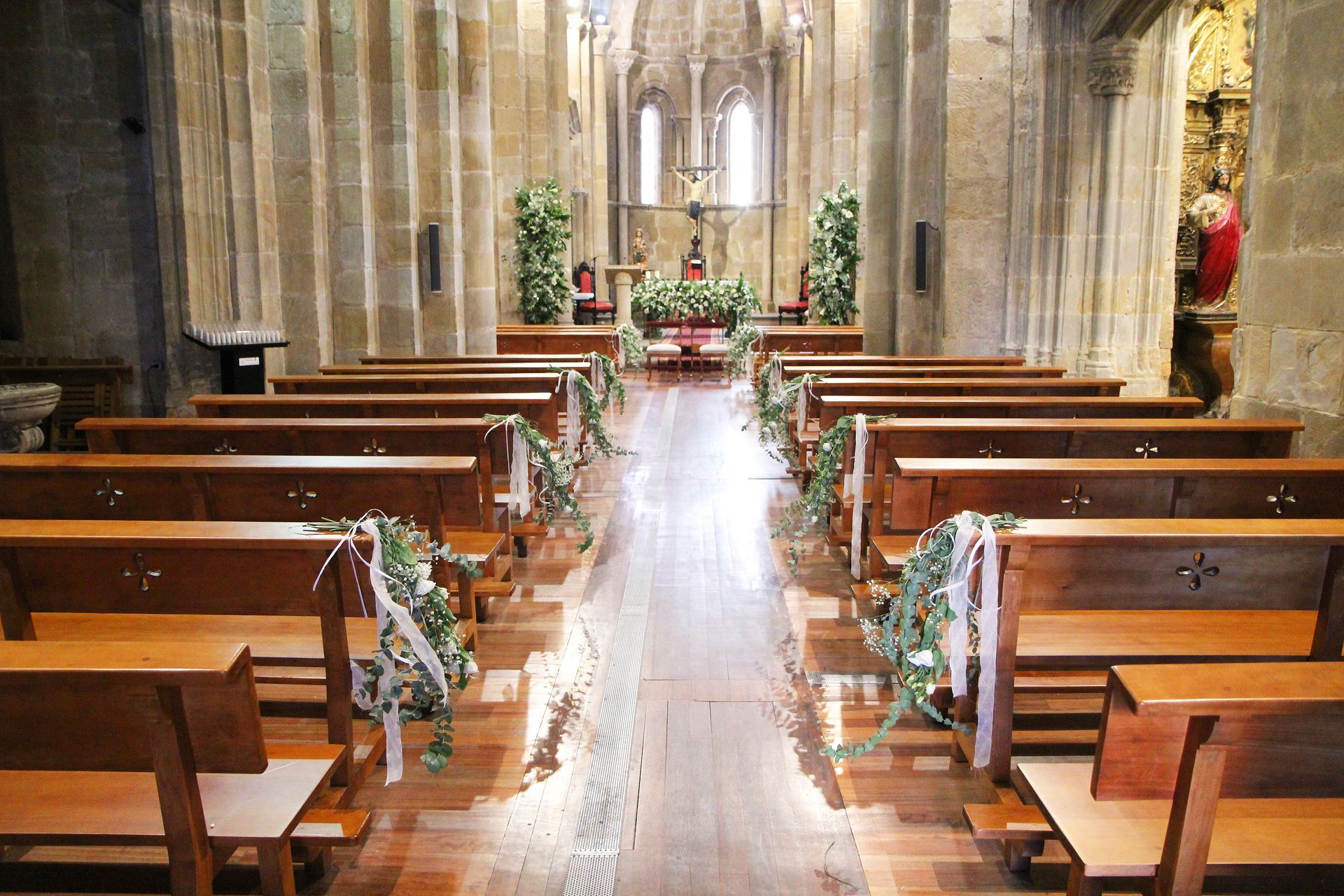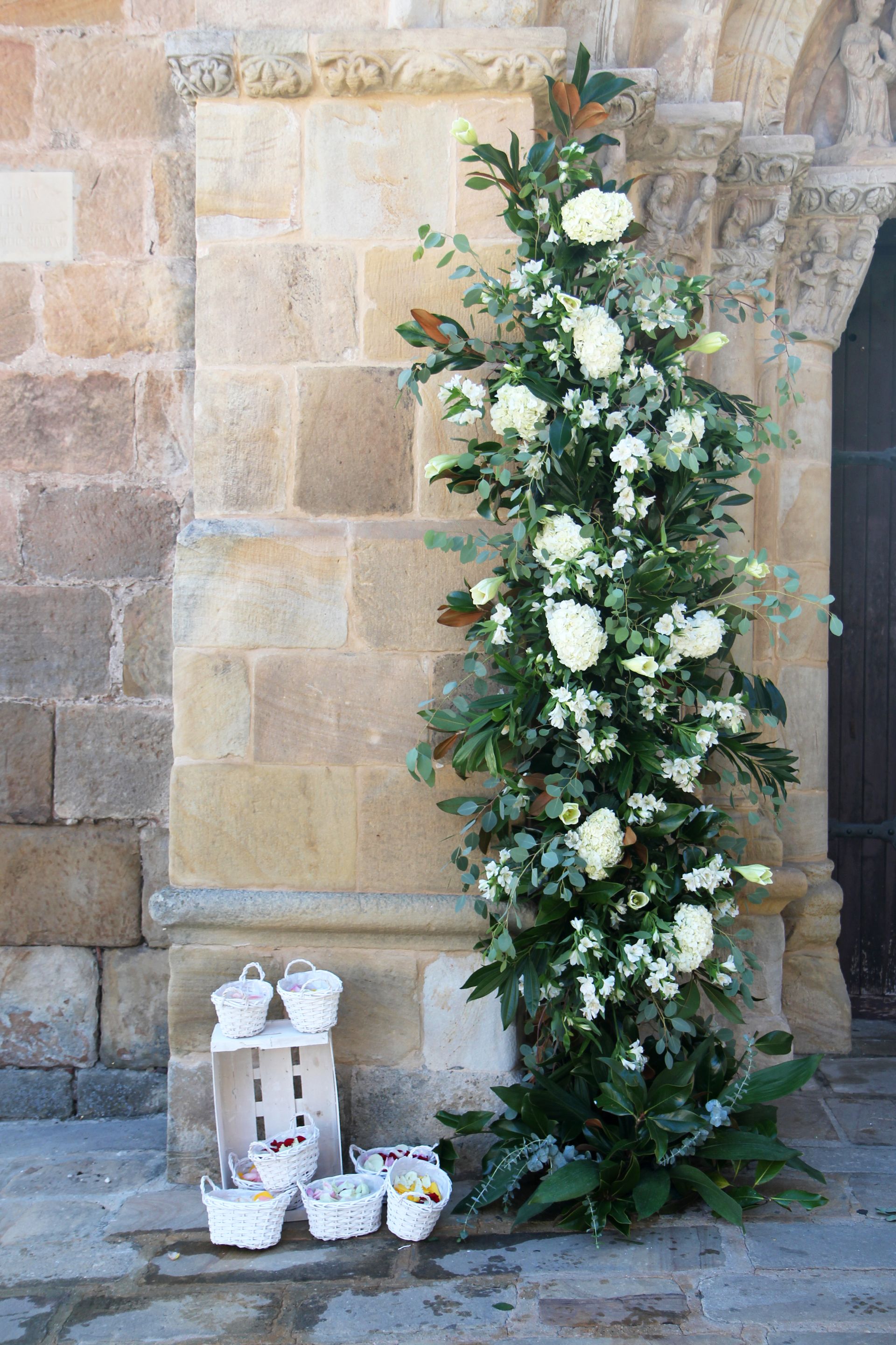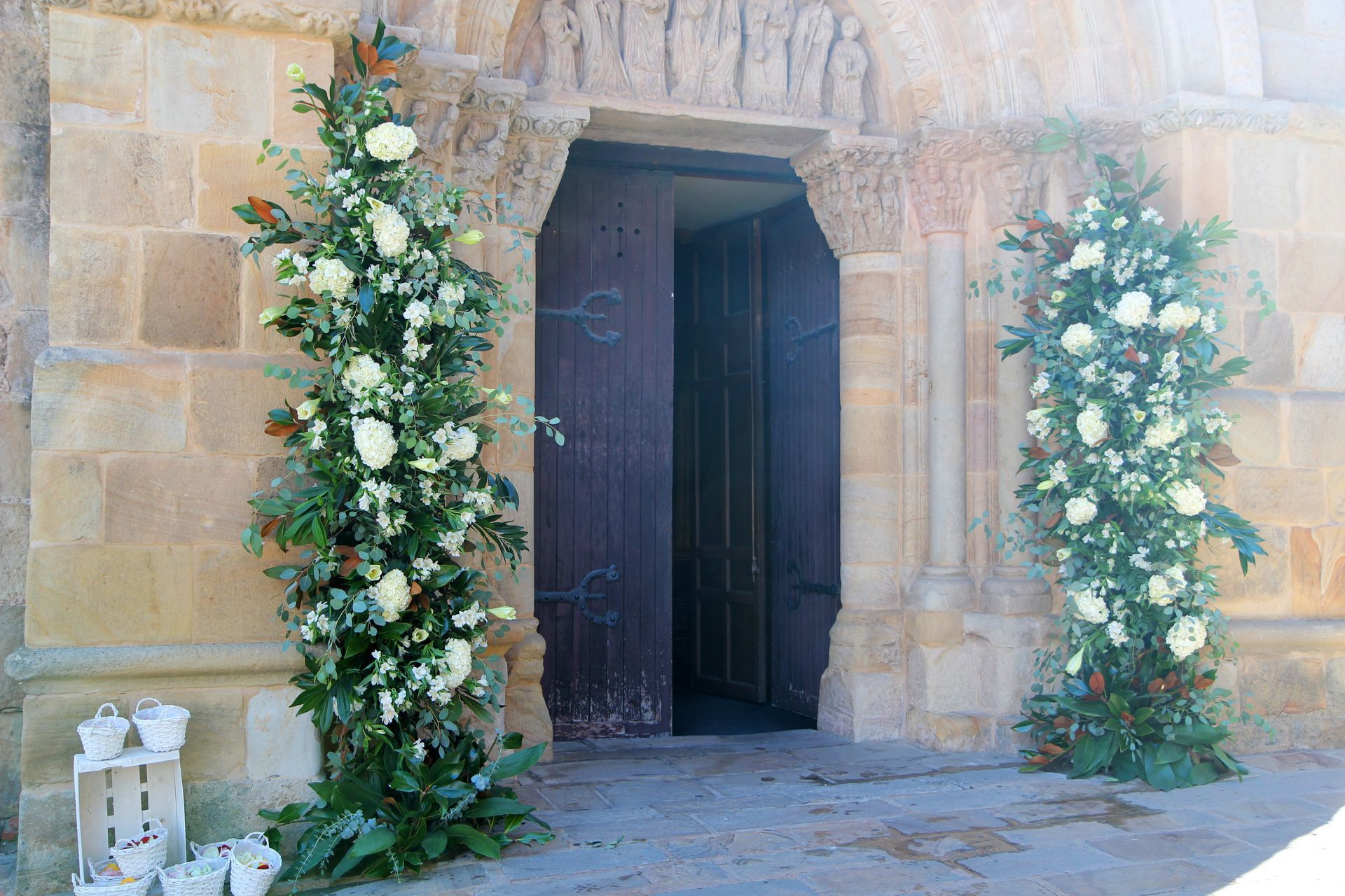 Los bancos del pasillo tienen adornos de ramos caídos y en la entrada se han colocado dos columnas grandes junto a los cestos de pétalos y arroz.