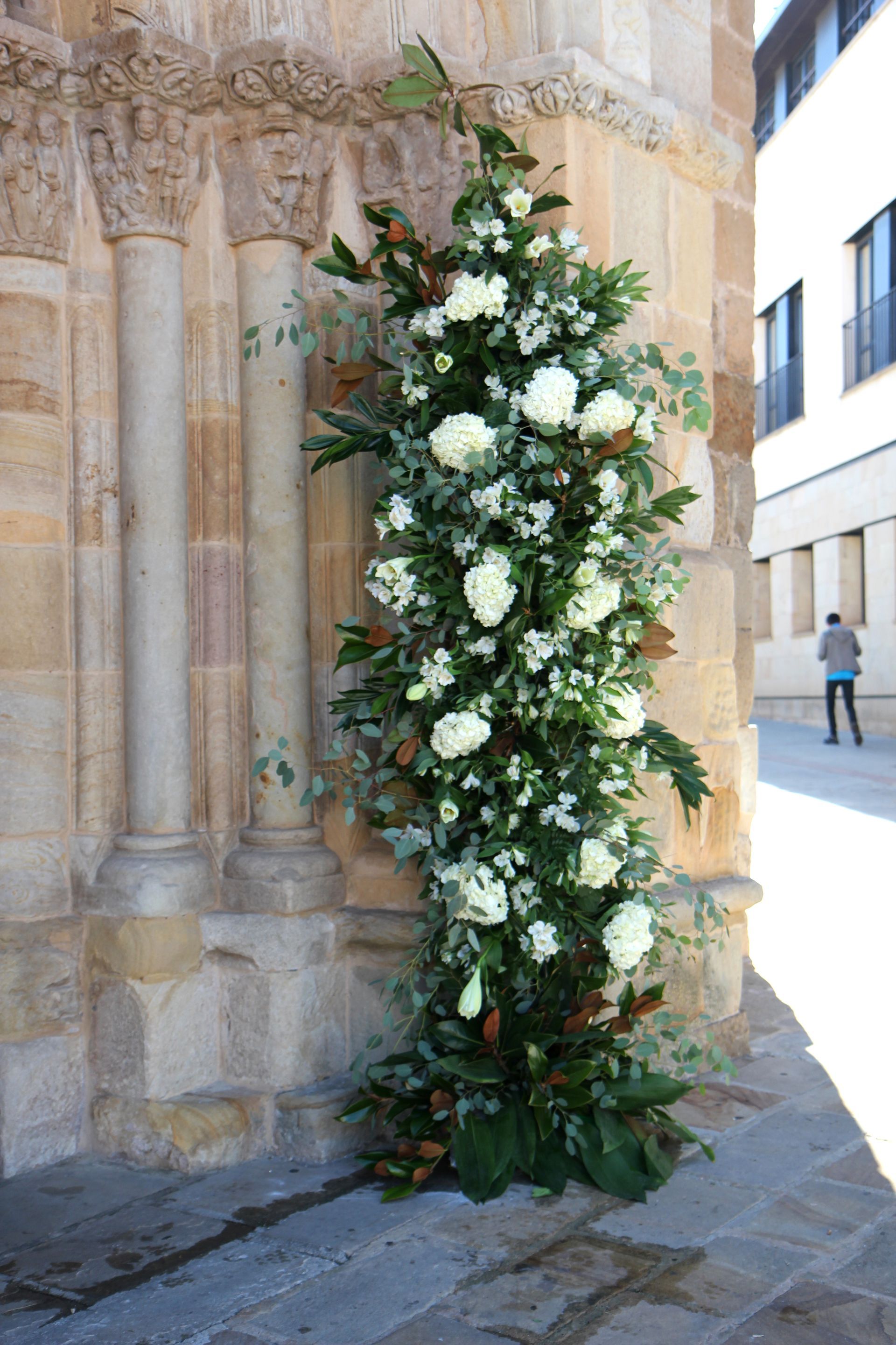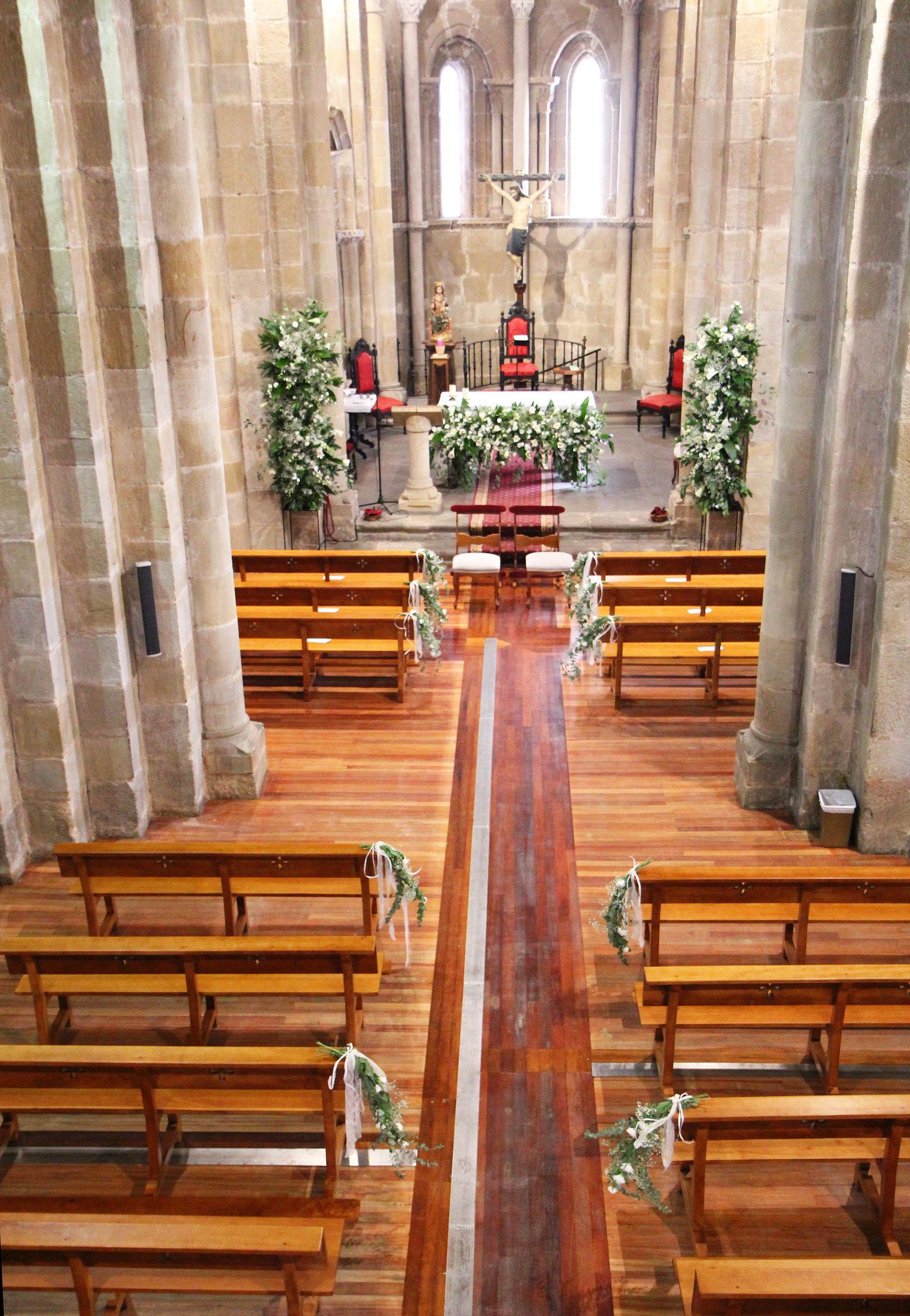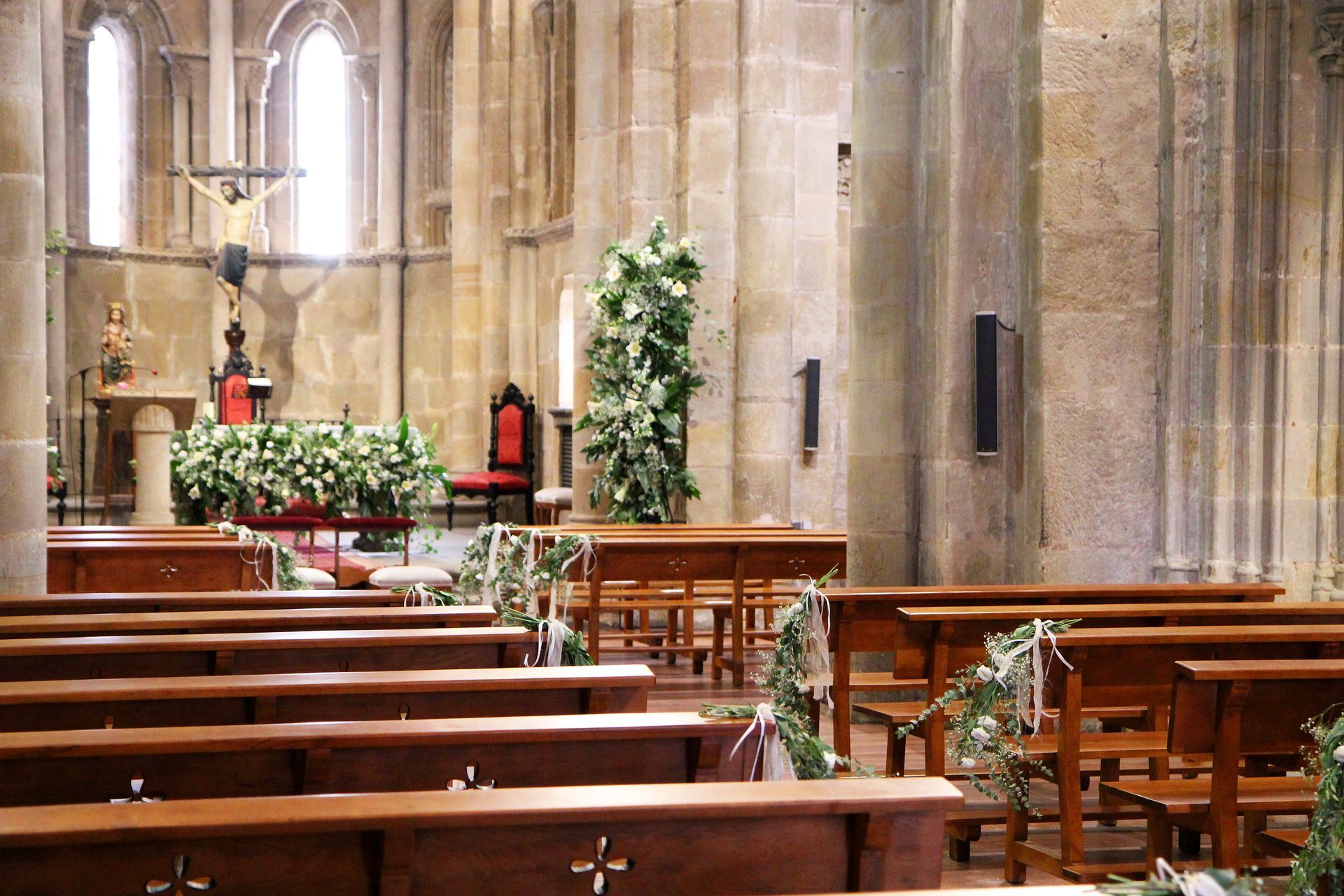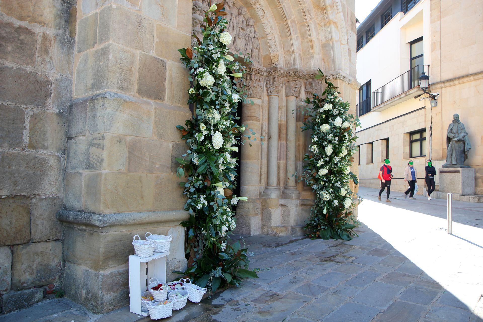 Los bancos del pasillo tienen adornos de ramos caídos y en la entrada se han colocado dos columnas grandes junto a los cestos de pétalos y arroz.