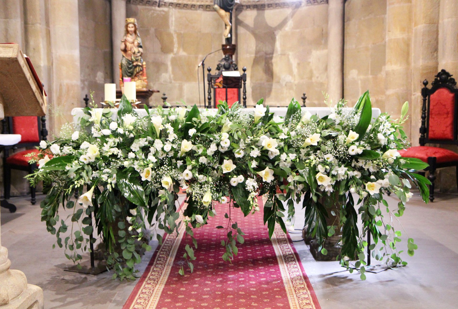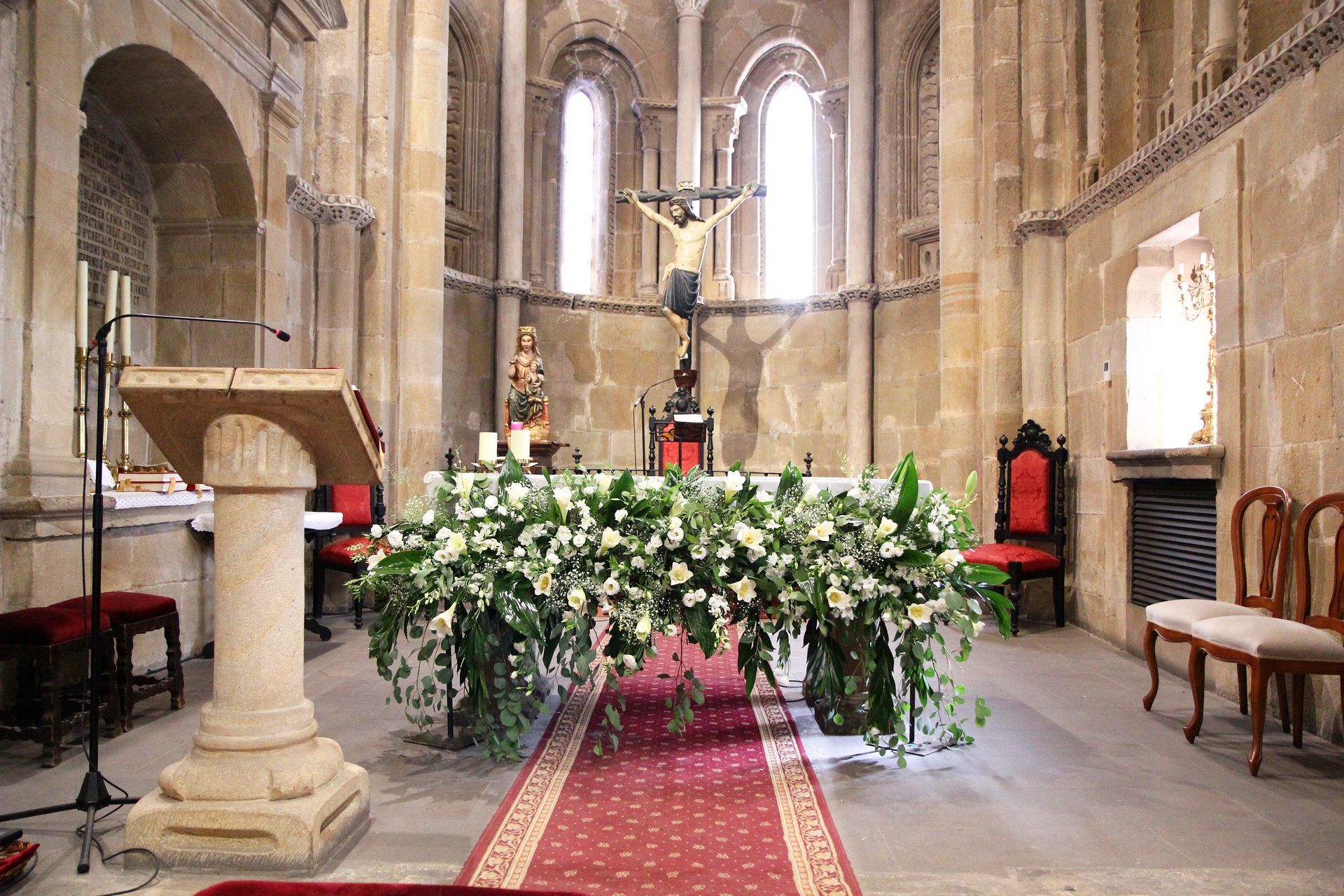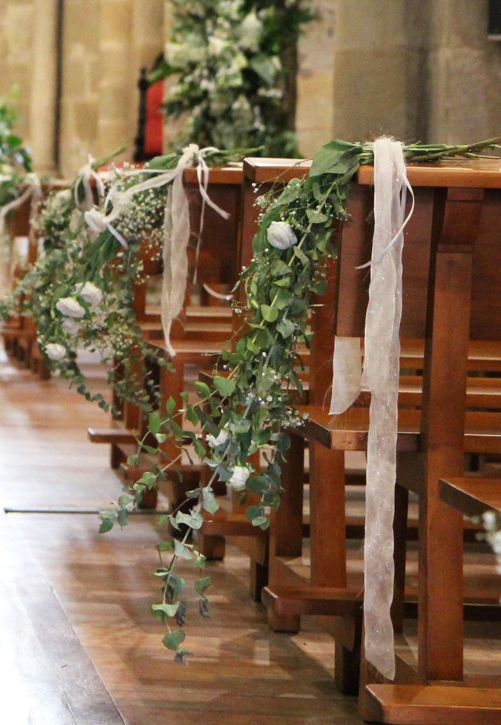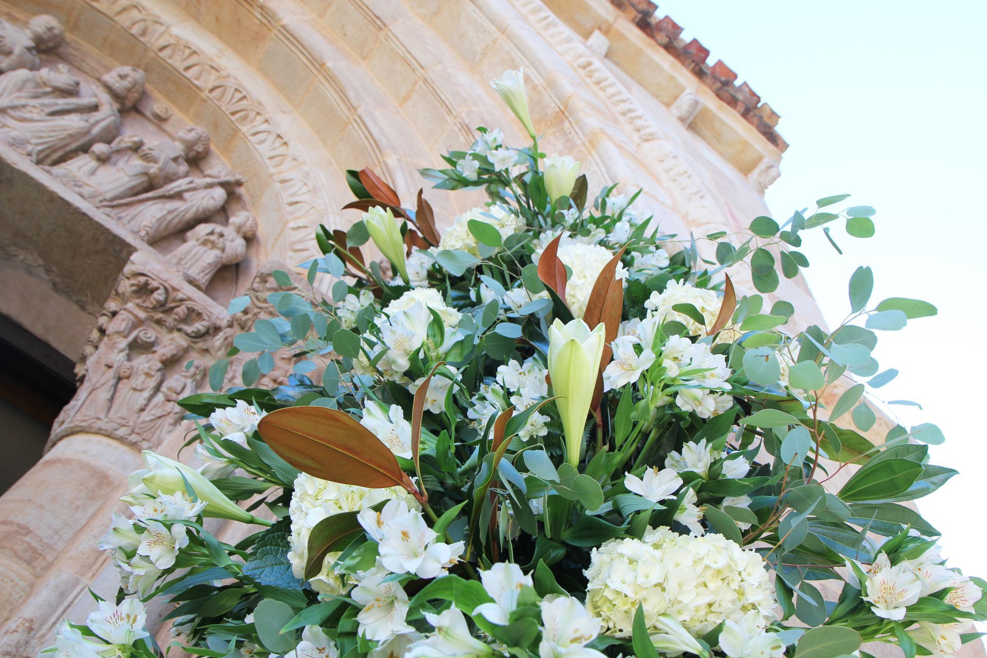 Los bancos del pasillo tienen adornos de ramos caídos y en la entrada se han colocado dos columnas grandes junto a los cestos de pétalos y arroz.
