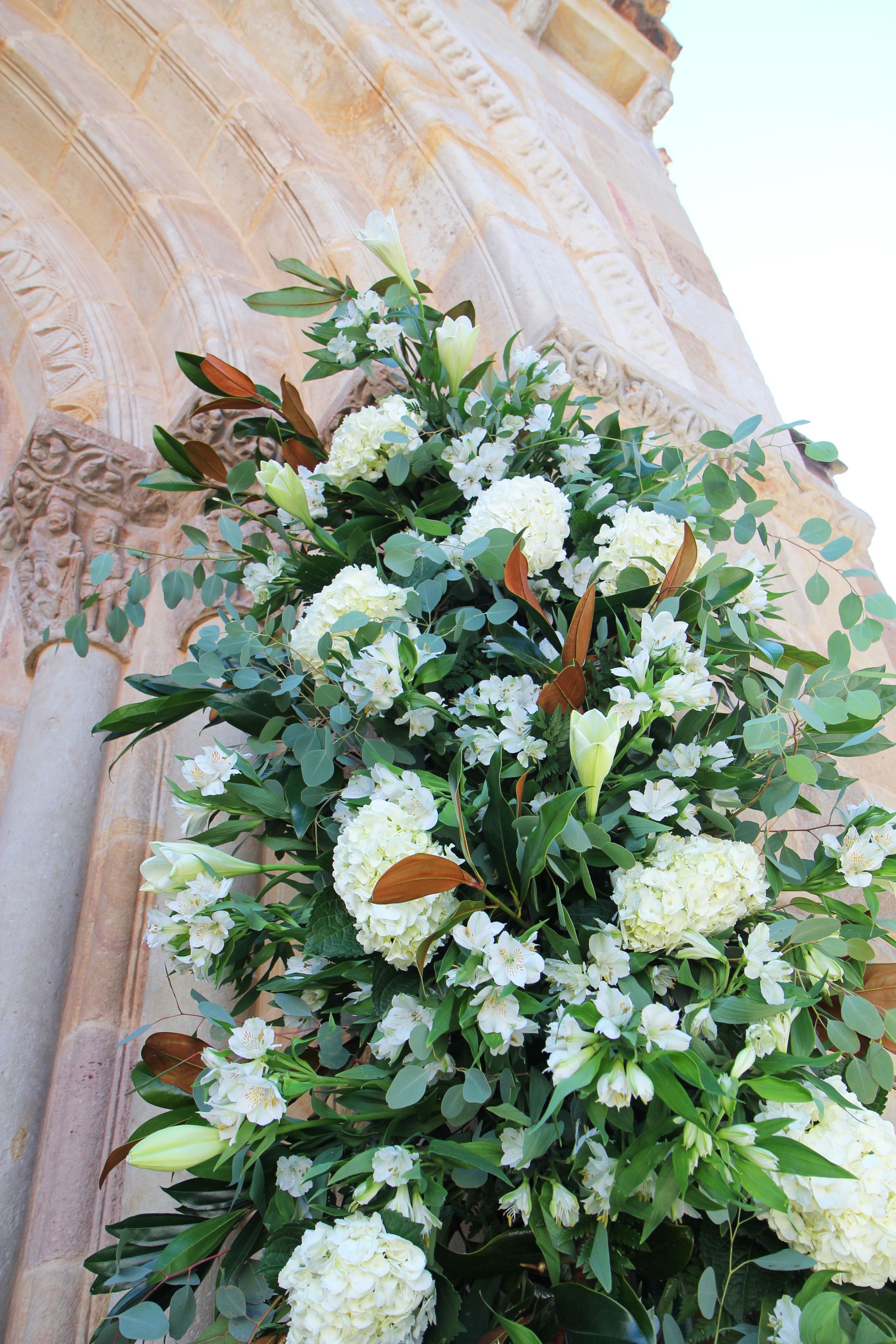 Realizado con flores de hortensias blancas, lisiantum y alstroemeria.